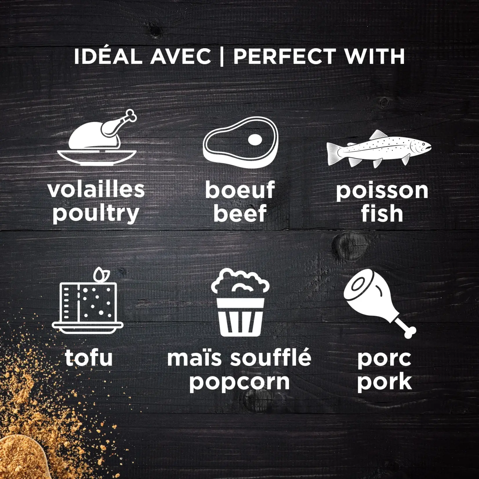 Idéal avec (et plus !) : saumon - poulet - porc - patates - steak - popcorn - tofu - fromage - marinades - Bloody Caesar - œufs - bacon, etc.