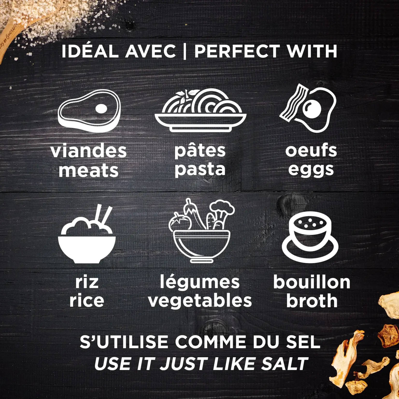 Découvrez les saveurs de la forêt boréale avec notre nouveau sel aux champignons sauvages cueillis à la main. Ce mélange unique remplacera à coup sûr votre sel de table! Il convient aussi aux moulins à sel si vous préférez une mouture plus fine.